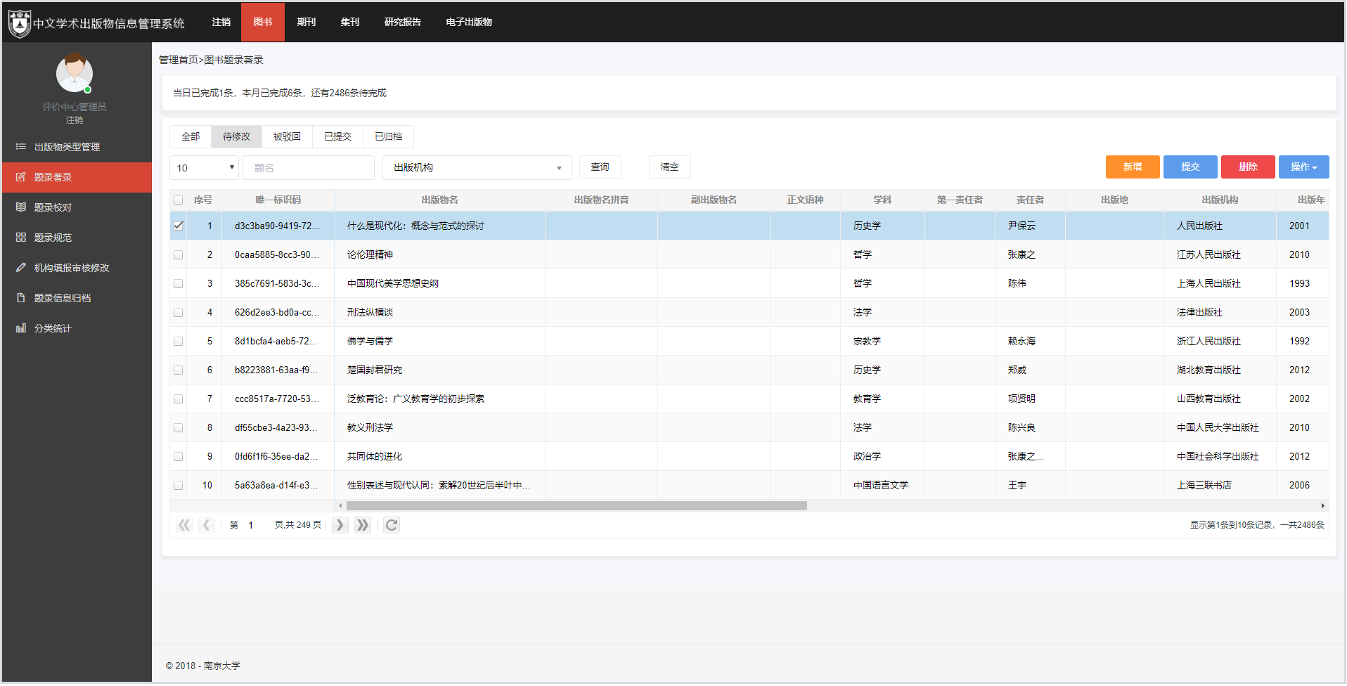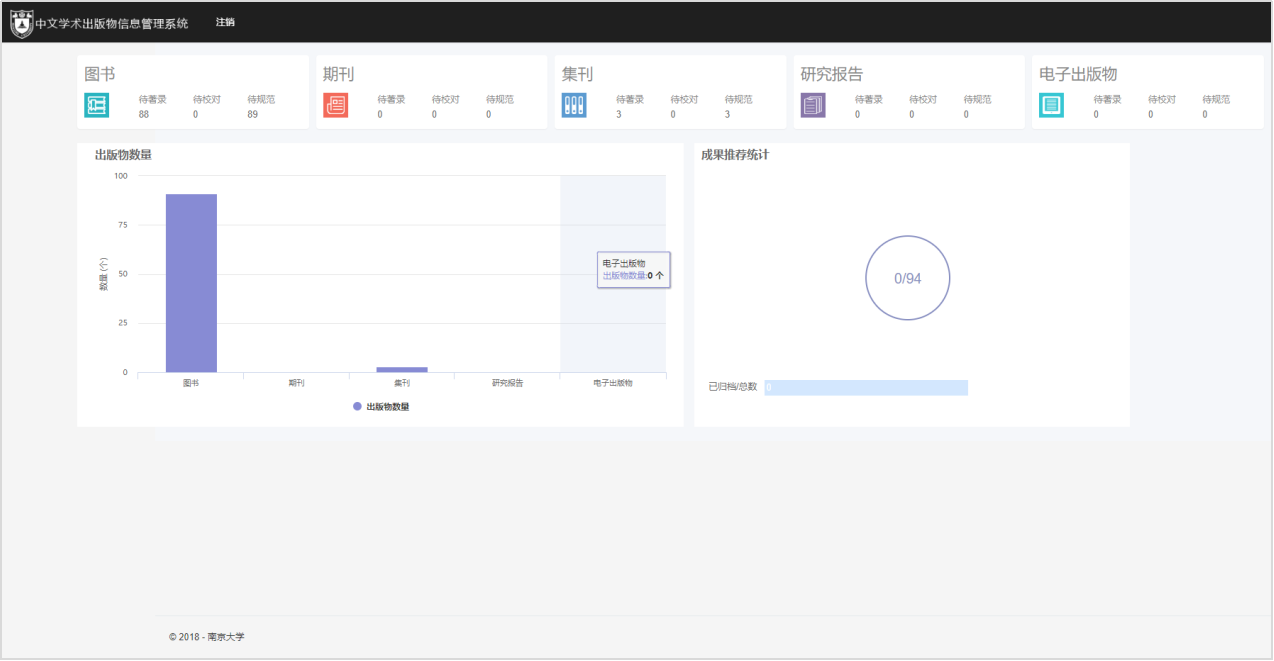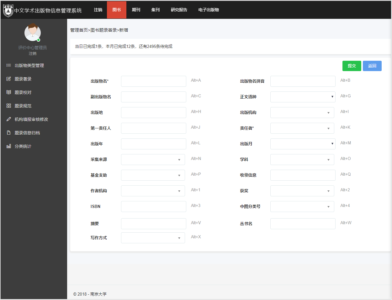 學(xué)術(shù)出版物信息管理系統(tǒng)是實(shí)現(xiàn)對(duì)出版物題錄信息原始數(shù)據(jù)著錄、校對(duì)、修信息數(shù)據(jù)庫(kù),并通過(guò)檢索篩選和定制導(dǎo)出方式形成初選數(shù)據(jù)。系統(tǒng)采用全鍵盤(pán)快捷操作的方式,準(zhǔn)確高效的實(shí)現(xiàn)數(shù)據(jù)的著錄和校對(duì)。同時(shí)系統(tǒng)提供操作行為和操作內(nèi)容記錄,綜合評(píng)定數(shù)據(jù)加工的工作量和工作效率,為中心的管理工作提供客觀真實(shí)有效數(shù)據(jù)依據(jù)。